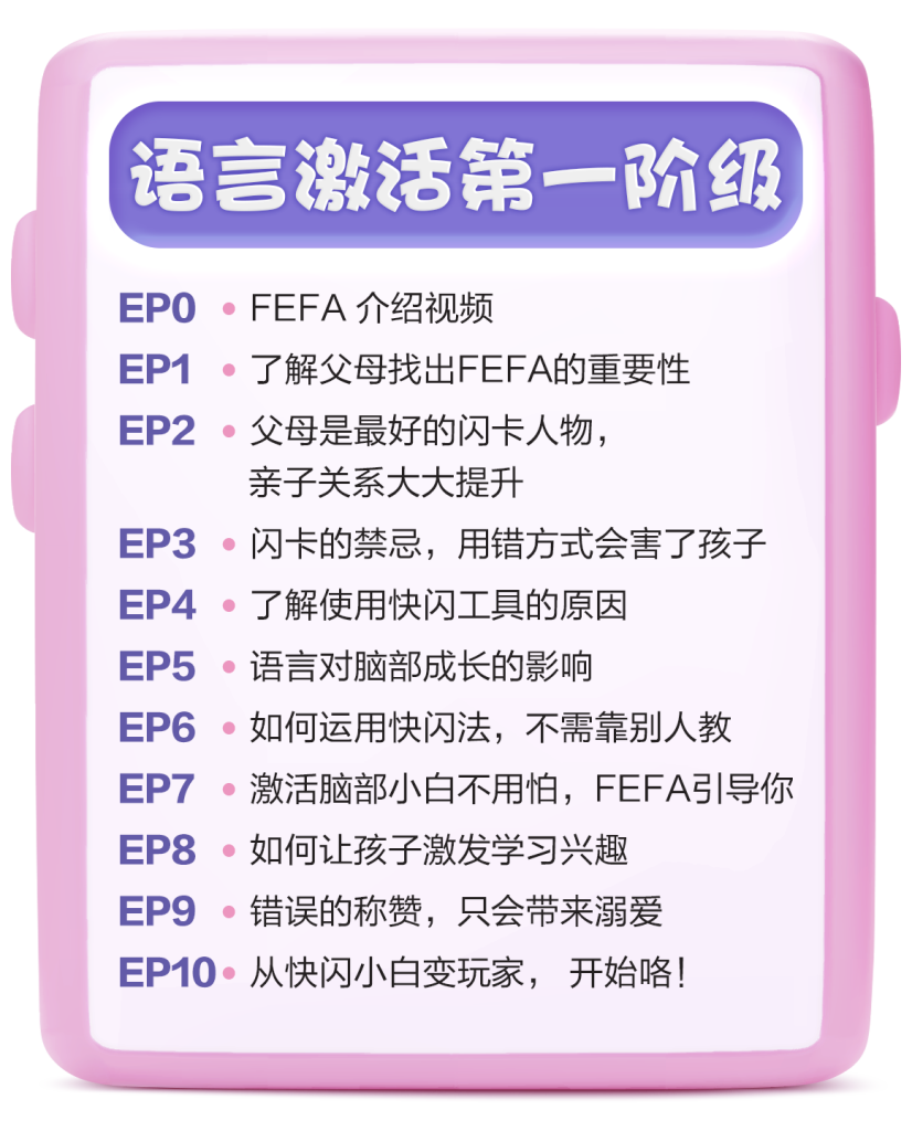 通过10集「555激活脑部」课程,帮助家长轻松掌握闪卡教学,为1-4岁宝宝打造愉悦的学习体验,全面激发孩子脑力发育,助力孩子从小领先一步!